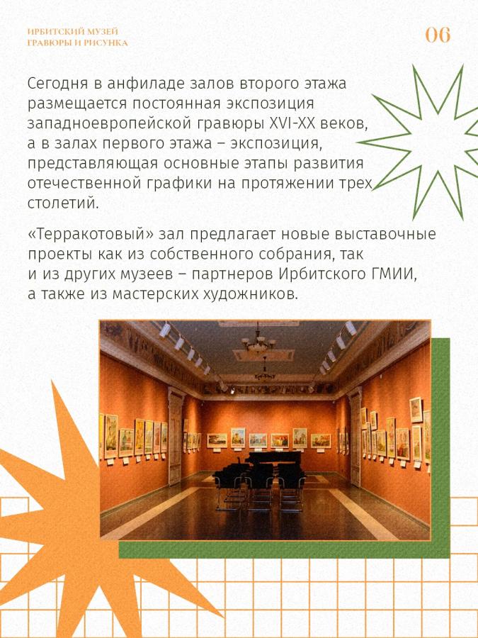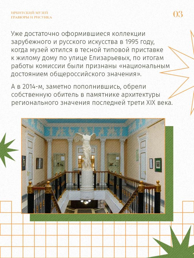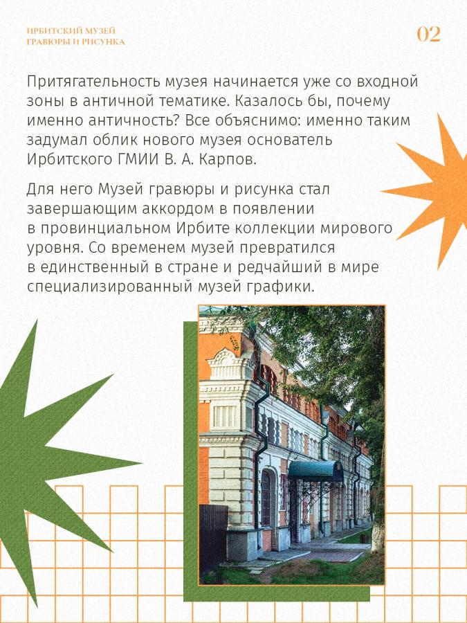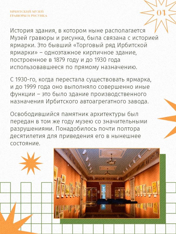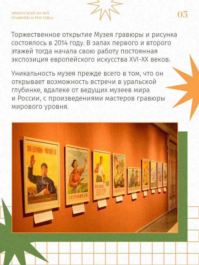 В сентябре 2014 года в Ирбите состоялось масштабное событие – торжественное открытие музея, без которого сегодня невозможно представить культурную жизнь города. Мы говорим про Музей гравюры и рисунка в составе Ирбитского государственного музея изобразительных искусств имени В. А. Карпова. За эти годы он стал одной из самых привлекательных для туристов выставочных площадок города.